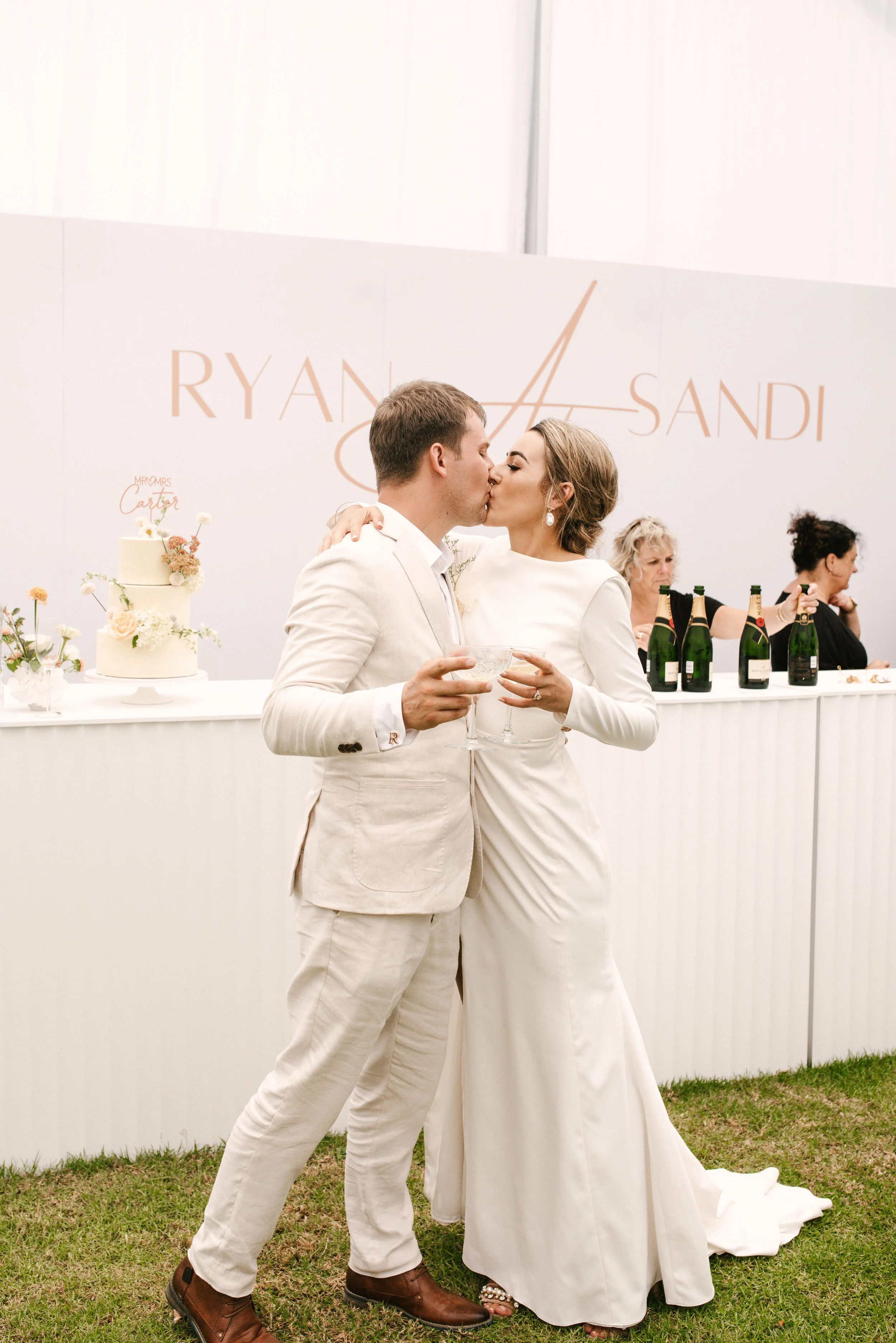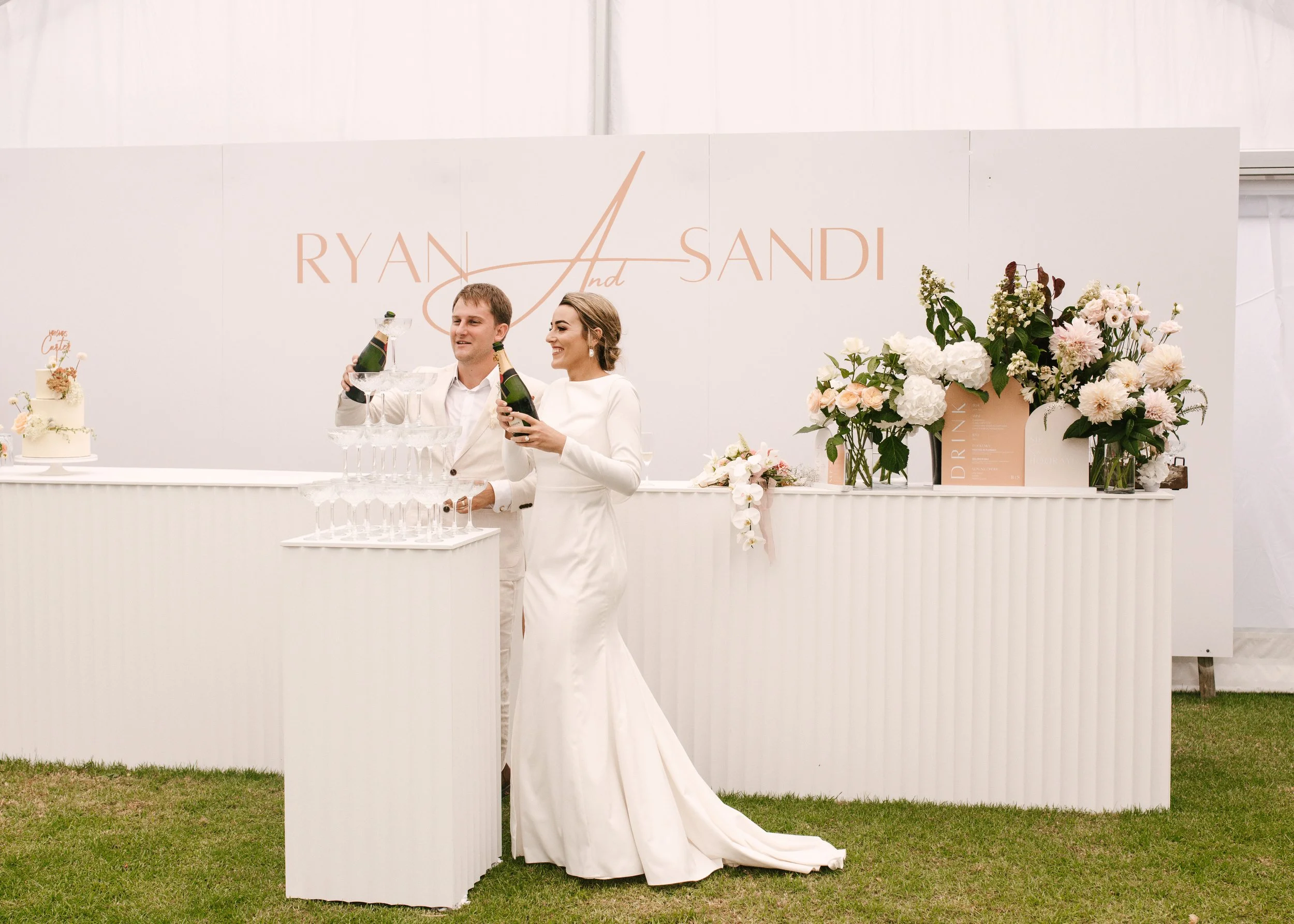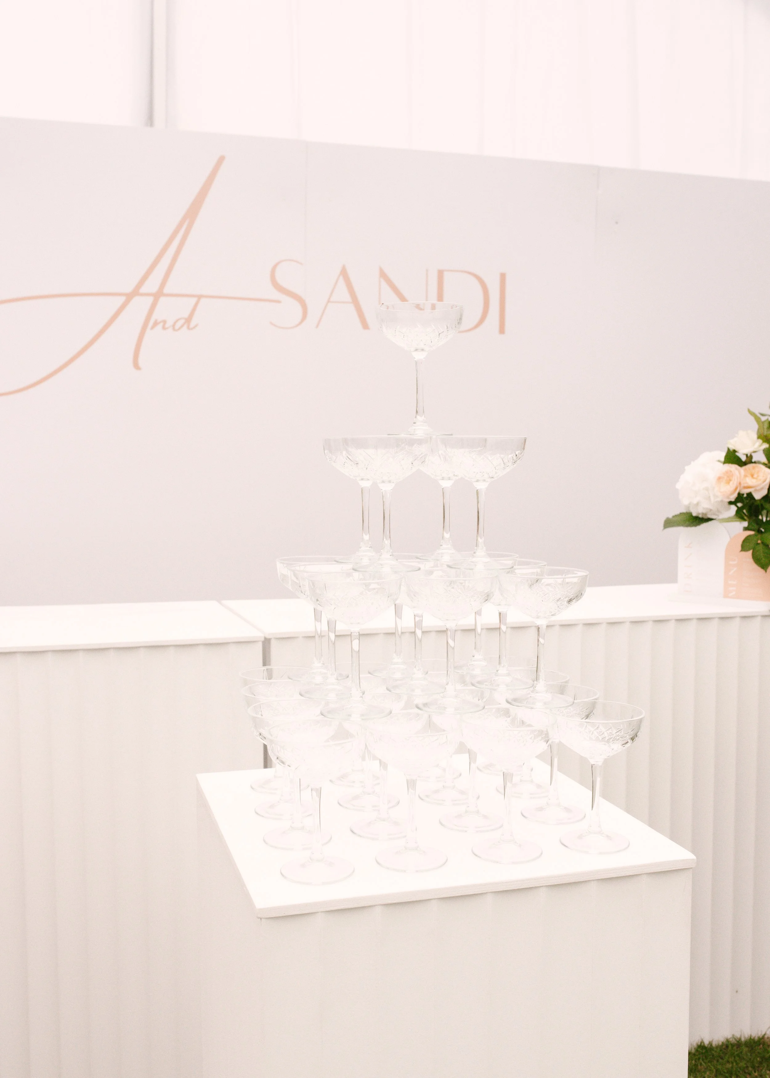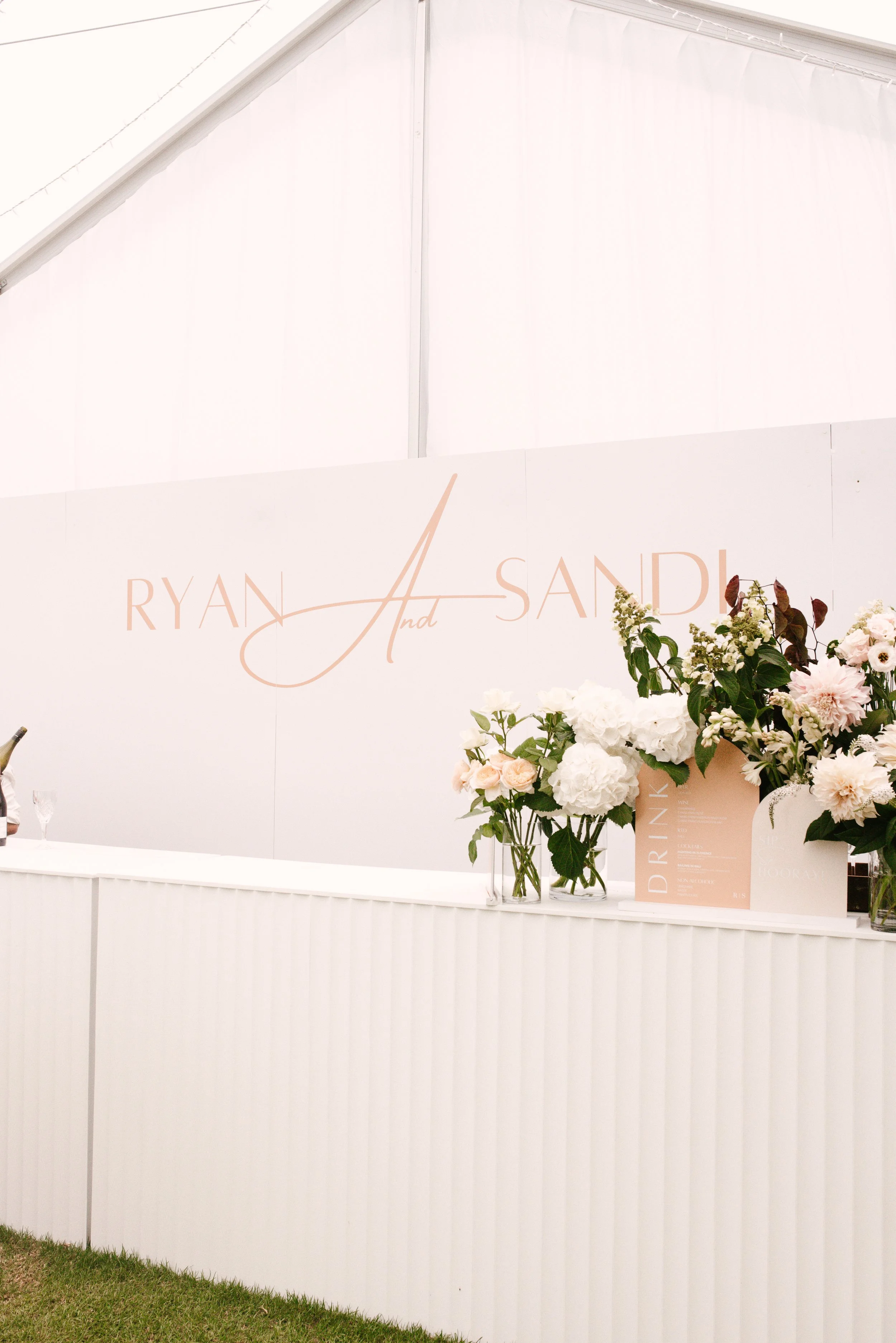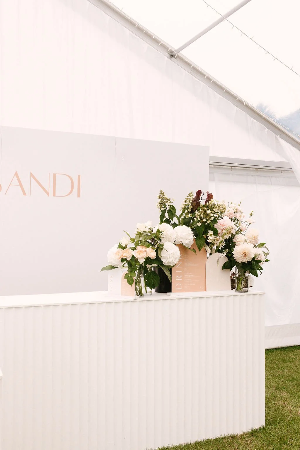 We’re obsessed with their style, and the use of our marquee curtain not only hid all their services and things that weren’t so pretty, but also created a soft & lush feeling along with our scallop bars & plinth - built especially by us for their big day.