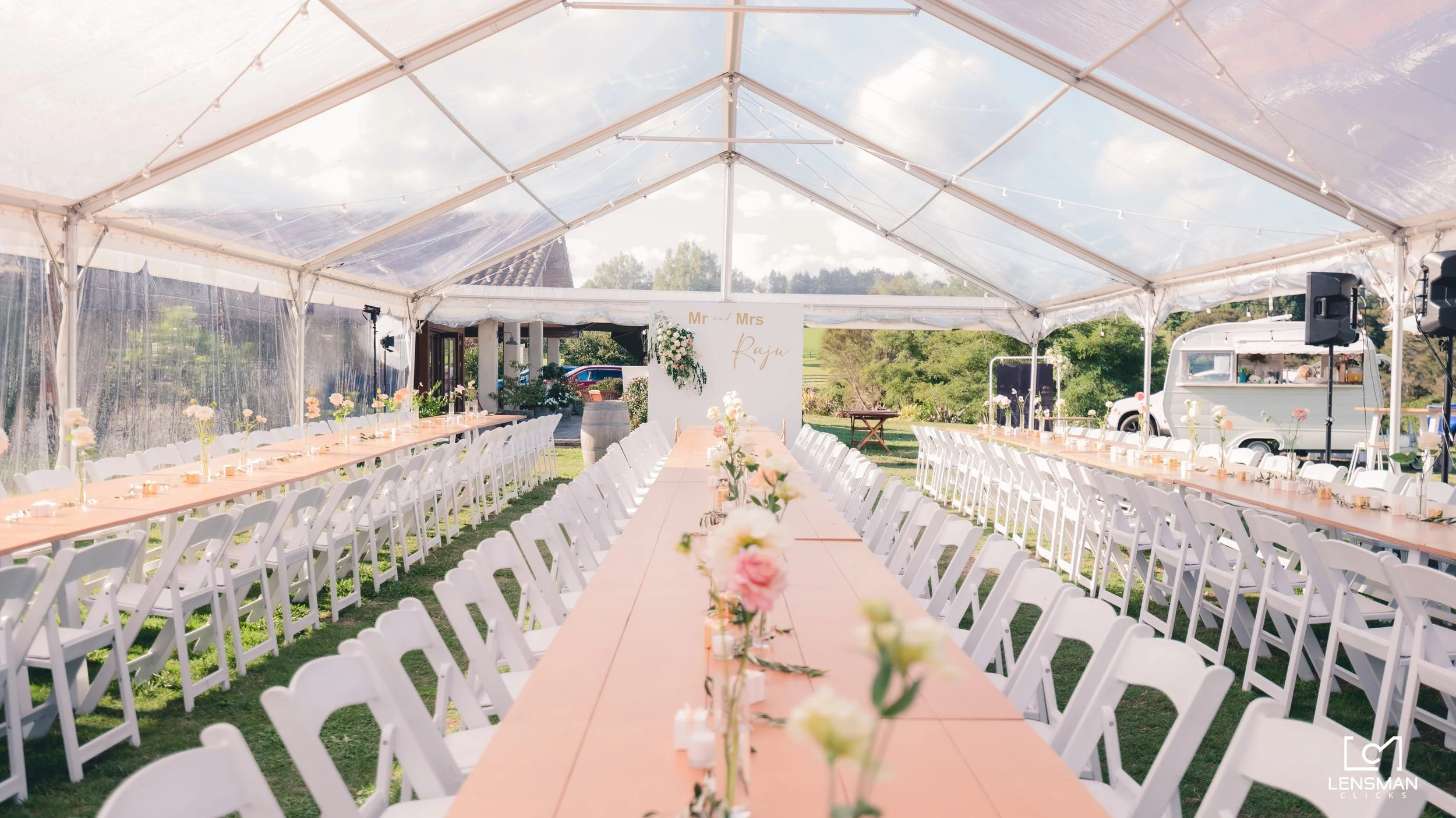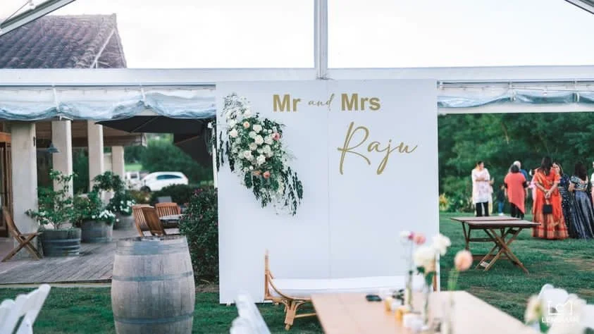 Festoons Lights and Poles | Signing Table | Dining Tables | Outdoor Umbrellas and Stands | Birch and White Bar Leaners | Scandi Bar Stools | Wine Barrels (without hole) | Diamond Rattan Bench | Rattan Armchair | Rattan Side Table | Rattan Sofa | White Metal Sign Stand (Large) | Feature Wall (and custom decal) | Dance Floor | 10x25m Clear Marquee | Lola Chair