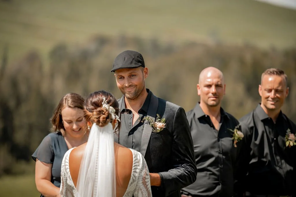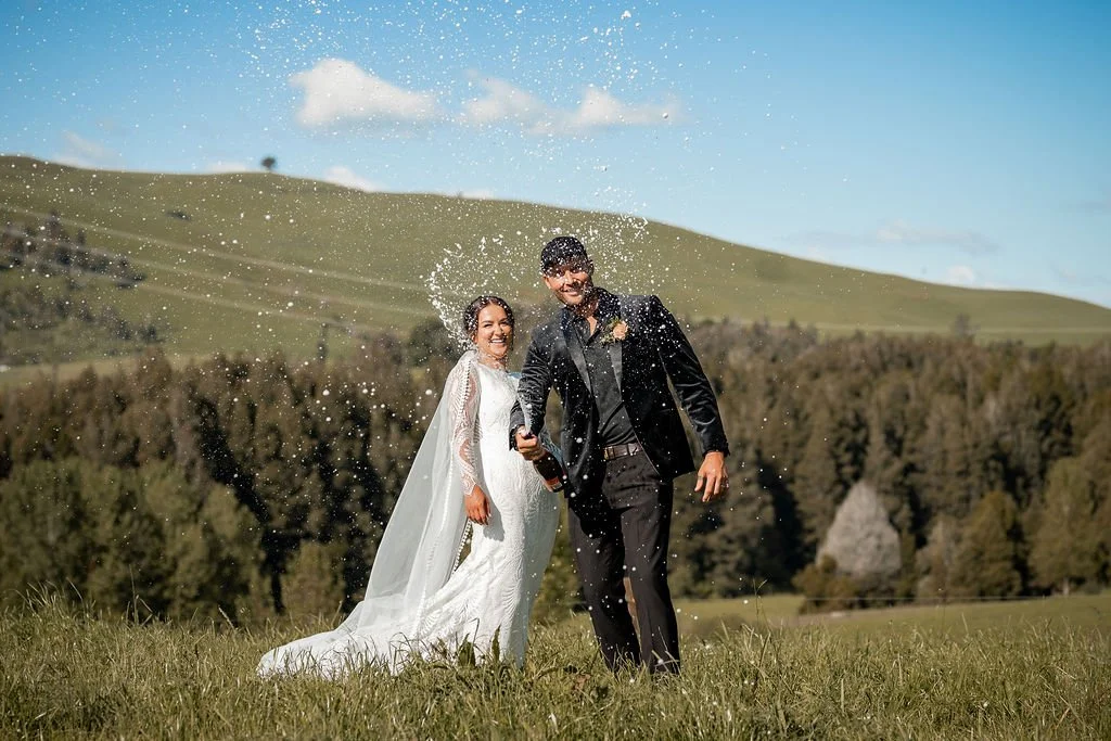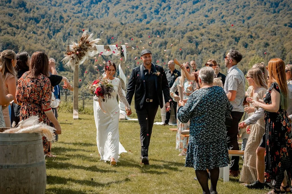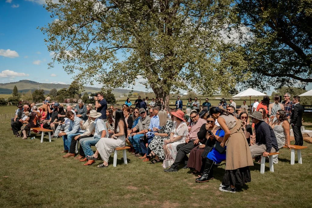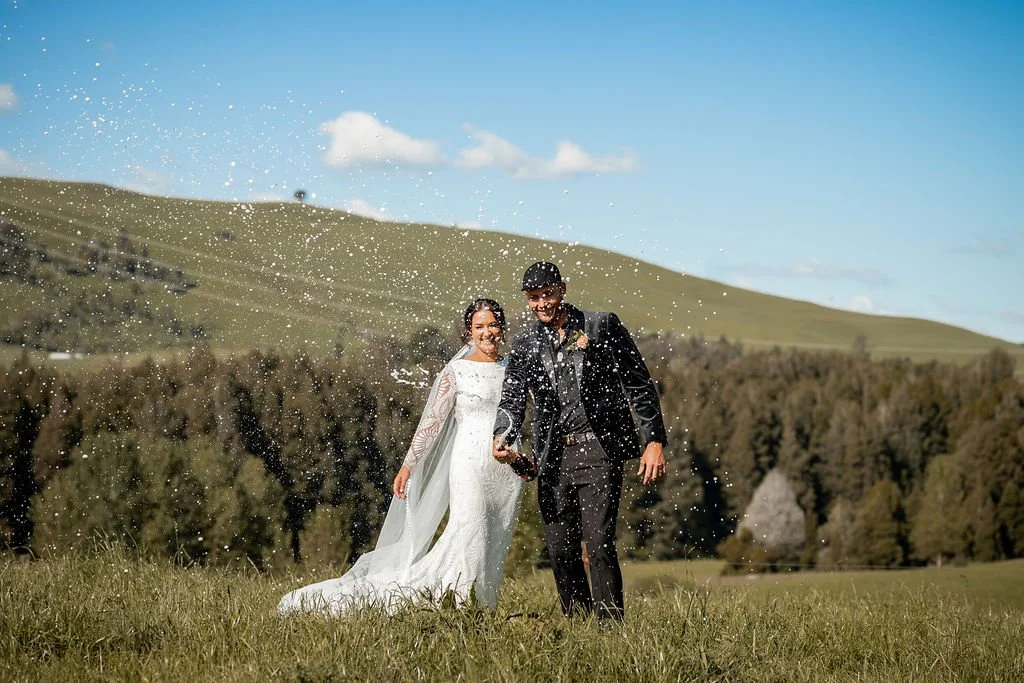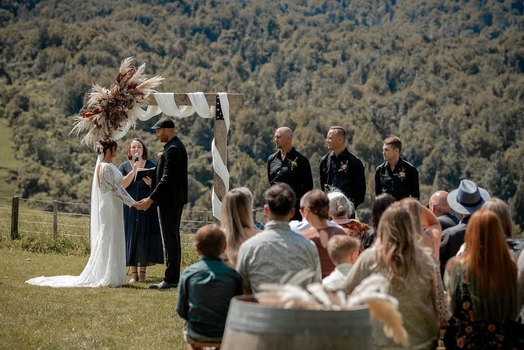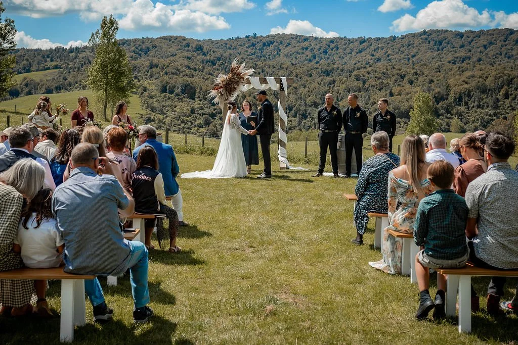 | Ceremony + Reception venue: Te Miro Domain | Photographer and Videography: Two Creative Photography | Hire: Love Club Hire | Florist: Aster + Bloom | Cake: Whipped by Geo | Hair and makeup: Hair: Cherie B Hair, Make Up: Skinvae | Dress: Gown + Altar |