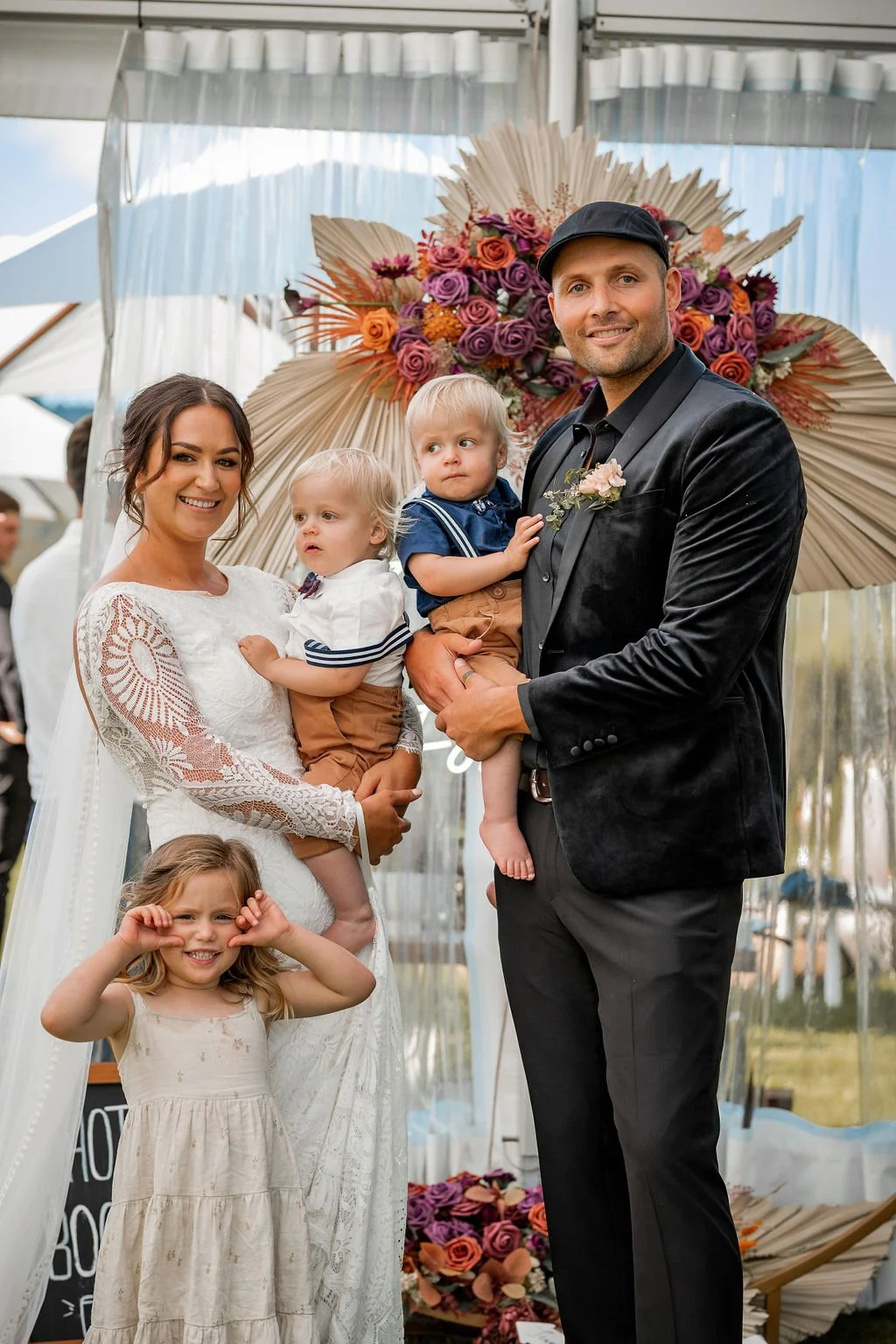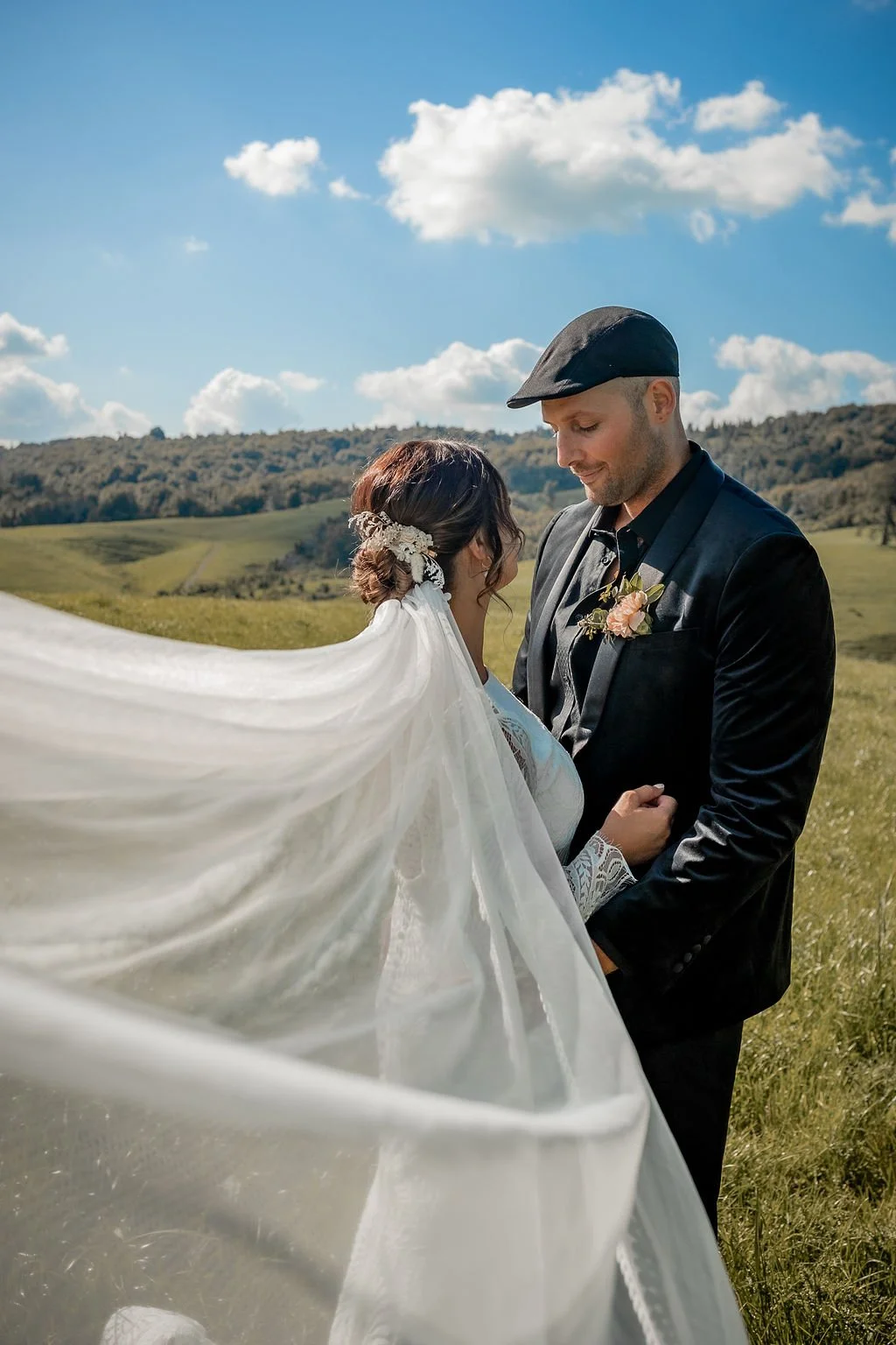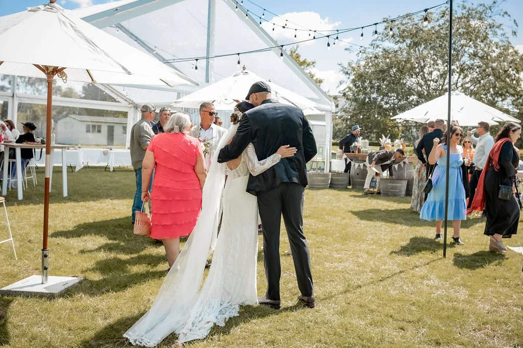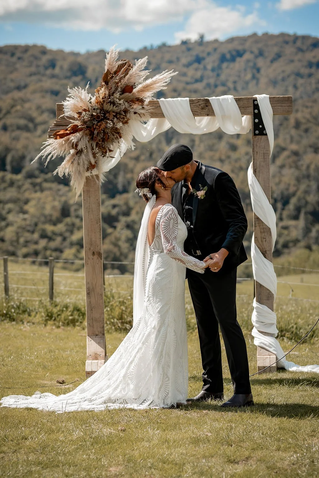 | Ceremony + Reception venue: Te Miro Domain | Photographer and Videography: Two Creative Photography | Hire: Love Club Hire | Florist: Aster + Bloom | Cake: Whipped by Geo | Hair and makeup: Hair: Cherie B Hair, Make Up: Skinvae | Dress: Gown + Altar |