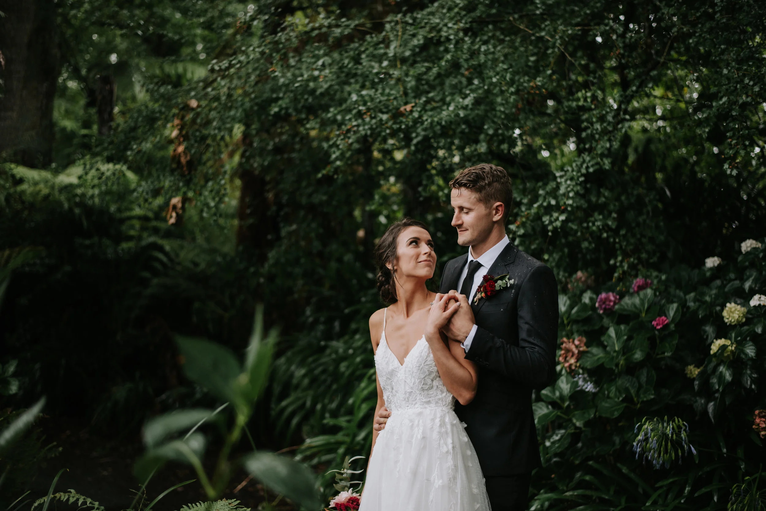 Being held at Woodlands gave it a rustic feel, the bridesmaid dresses were a forest/emerald green colour, our flowers were wildish with pops of burgundy. It also ended up being a wet day and that added another element – certainly made for some wild memorable moments.